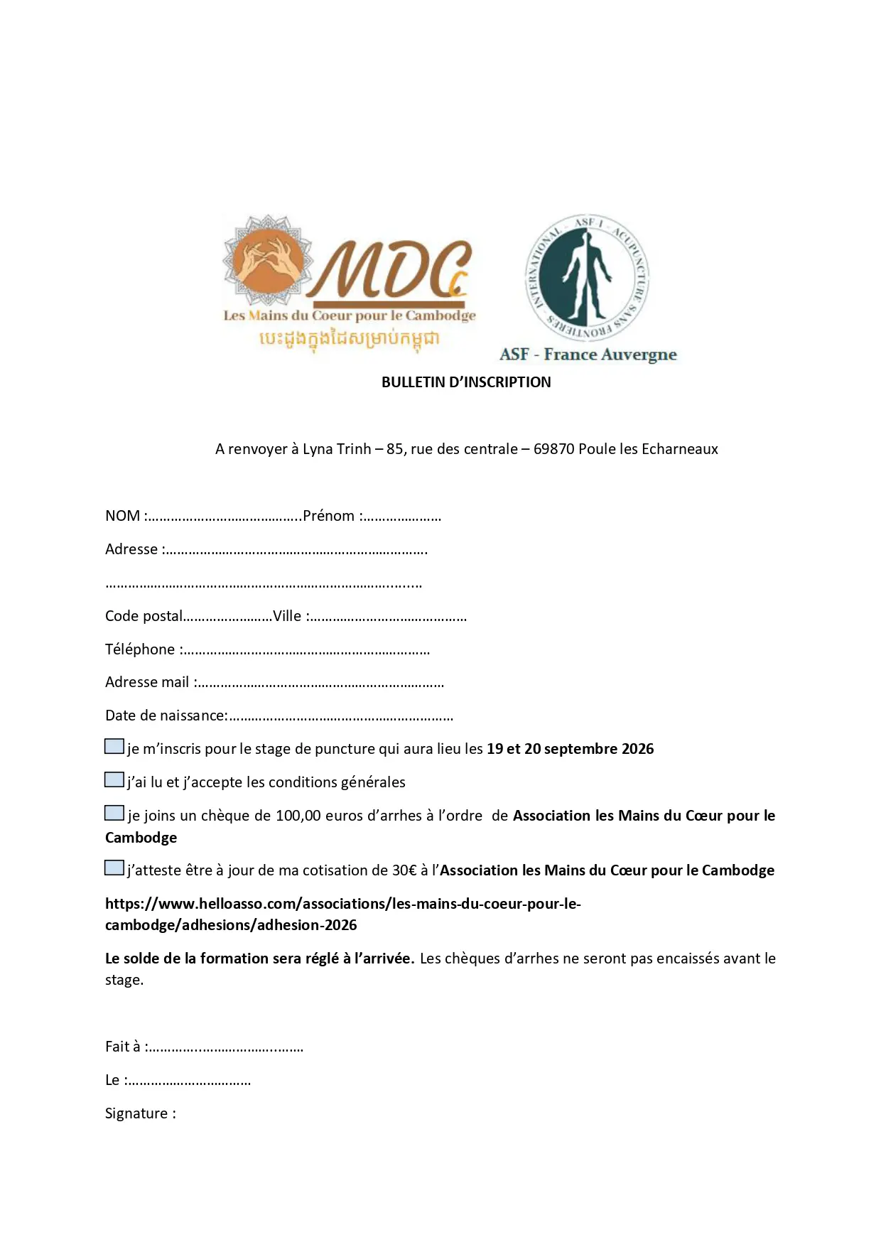 Inscription : merci de remplir le bulletin d’inscription et de l’envoyer à Lyna Trinh 85, rue des centrale 69870 Poule les Echarneaux.