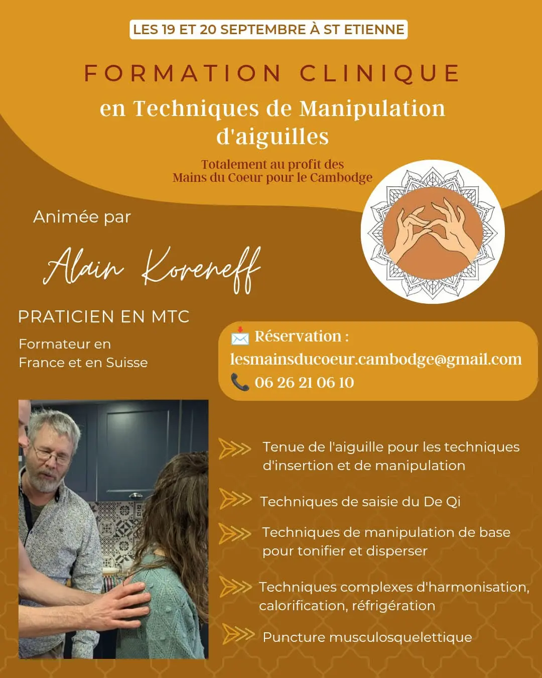 💛 Cette formation a une dimension solidaire : l’intégralité des bénéfices sera reversée à l’association MDCC – Mains du Cœur pour le Cambodge, qui mène des missions de formation et de soins au Cambodge afin de transmettre des pratiques de santé et de soutenir les populations locales.